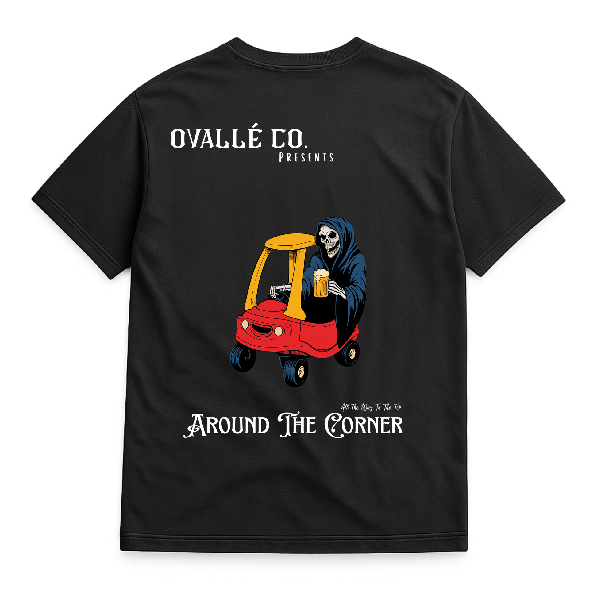 Cozy Coupe flips childhood nostalgia on its head — the Reaper riding in style with a cold drink in hand, cruising like the end is just another joyride. A bold, playful design that balances grit with humor, built on heavyweight cotton for everyday wear.