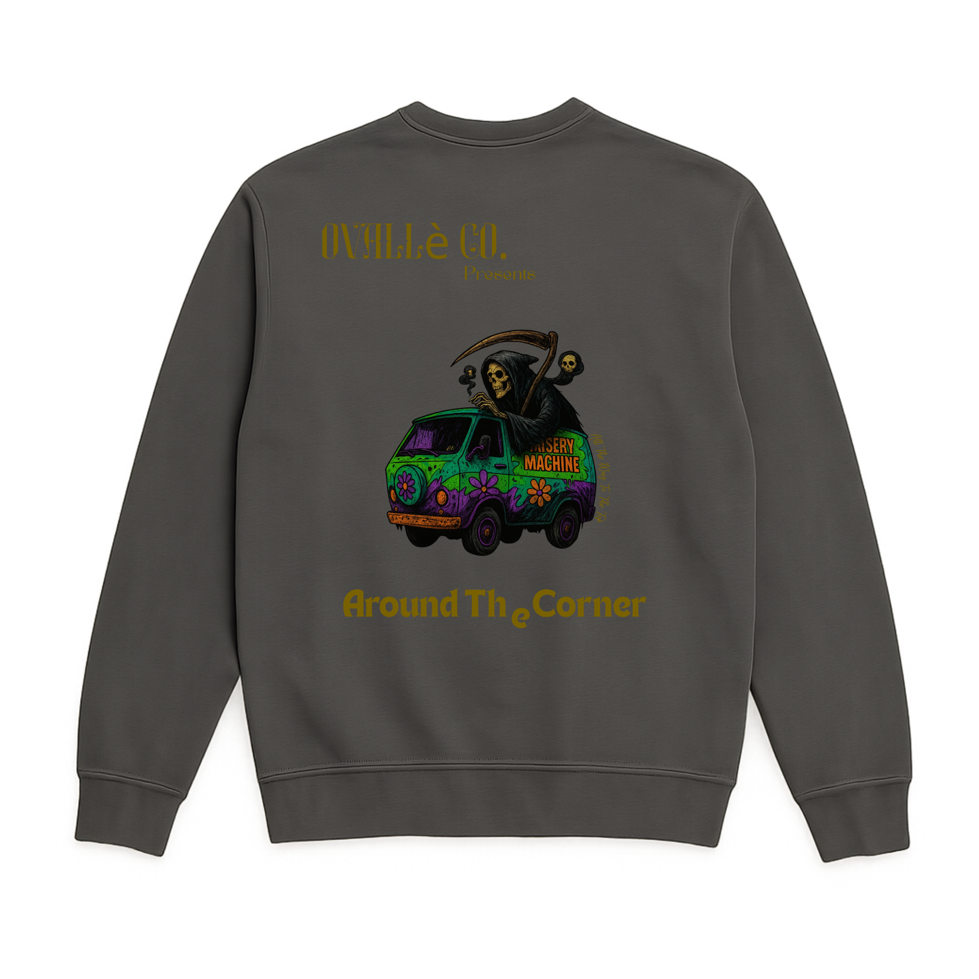 Misery Machine – Gold Label sharpens the cult-classic ride with a golden edge, the reaper at the wheel of a van that’s traded mysteries for mayhem. Printed on Pepper Comfort Colors heavyweight Crewneck.
