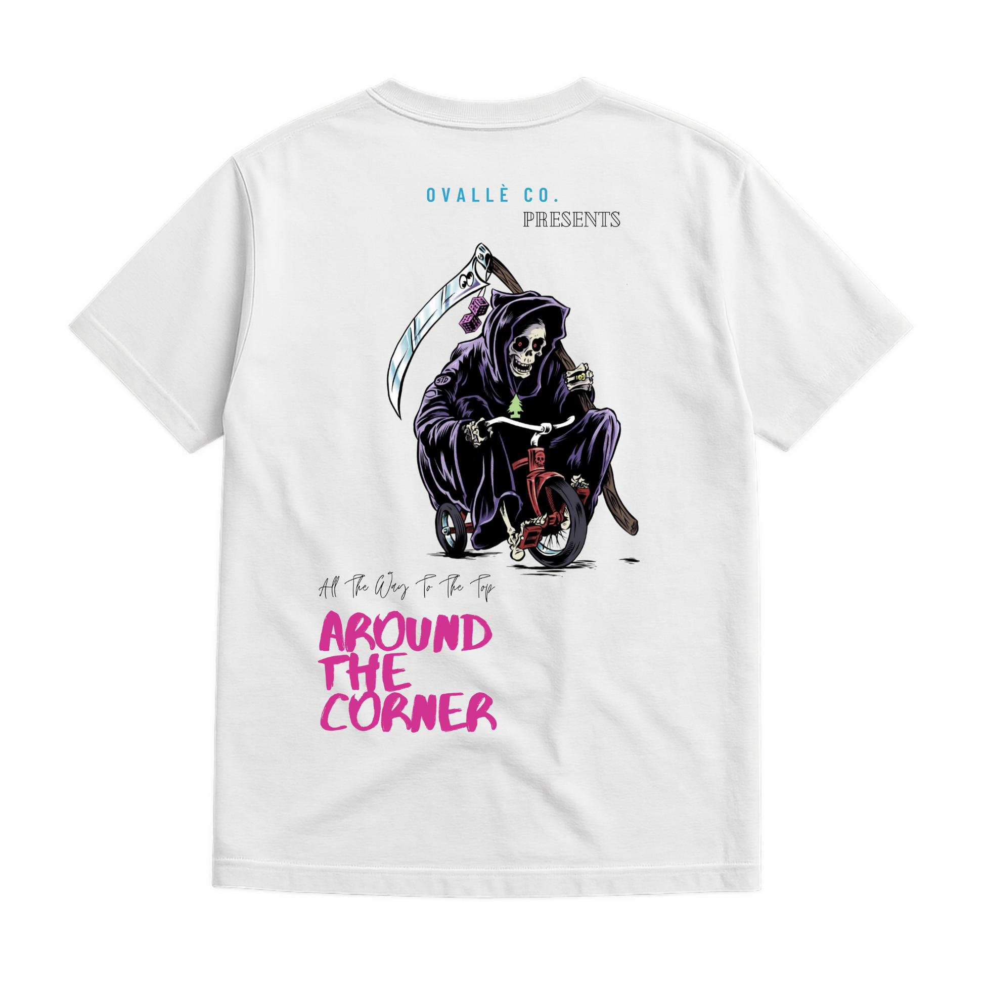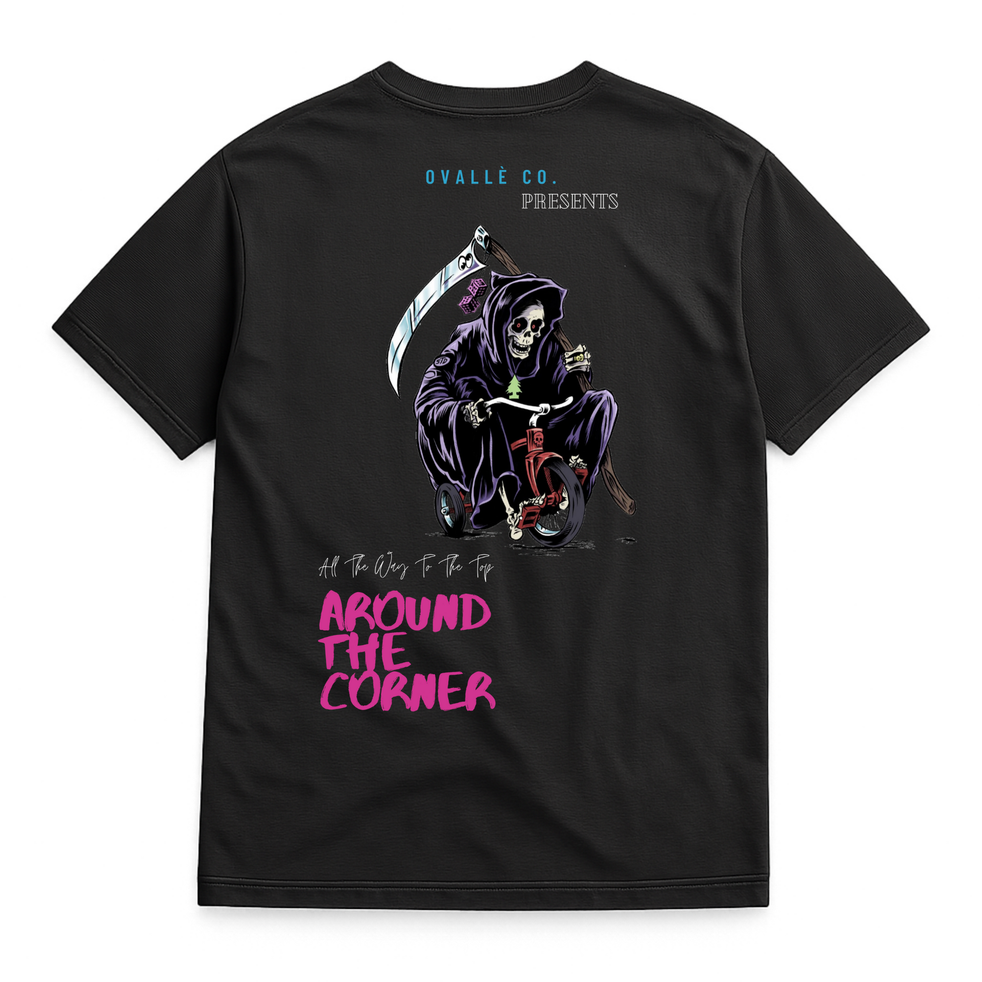 Ride or Die brings the Ovallè Co. edge with a twisted sense of humor — the Reaper trading his scythe for a tricycle, tearing forward with neon grit. A reminder that no matter the ride, it’s all the way to the top.
